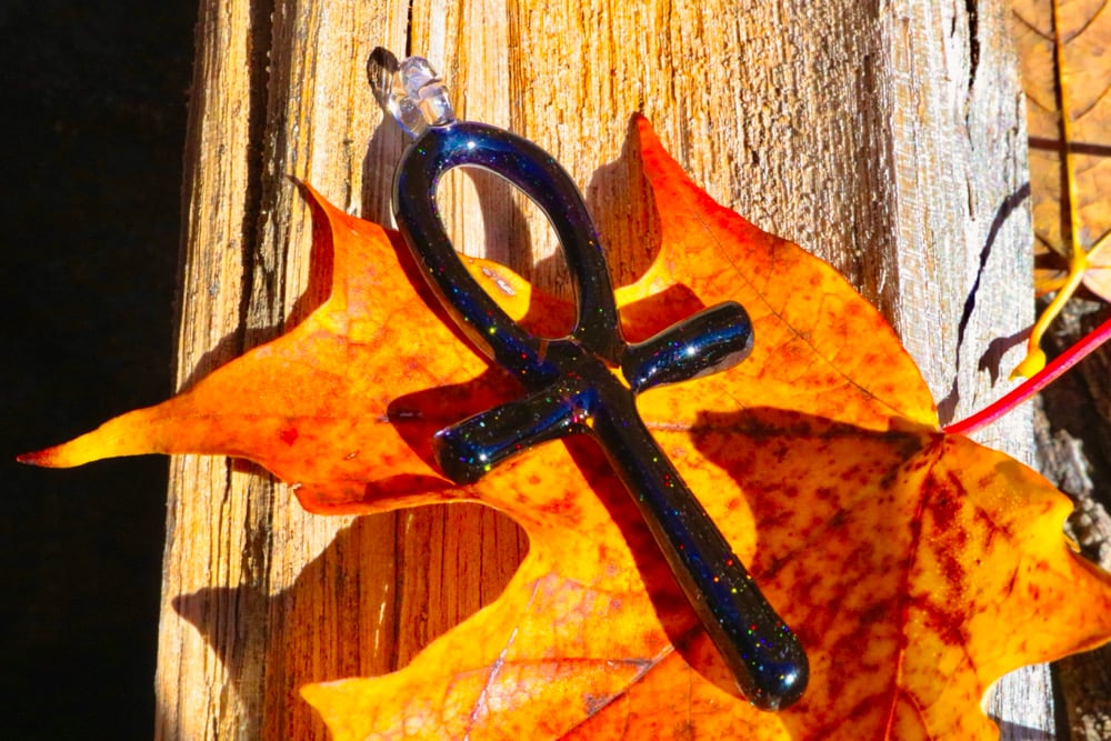 This Ankh talisman handcrafted with Clear Crushed Opal over Jet Black is such a powerful piece that offers the wearer great power and strength~